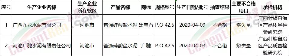 日前,廣西壯族自治區市場監督管理局發布包括水泥產品在內的25種產品質量廣西監督抽查情況的通報情況顯示,廣西九龍水泥有限公司黑寶石牌P.O42.5、河池廣馳水泥有限責任公司廣馳牌P.O42.5水泥各一個批次檢驗結果為不合格,不合格項目涉及燒失量。