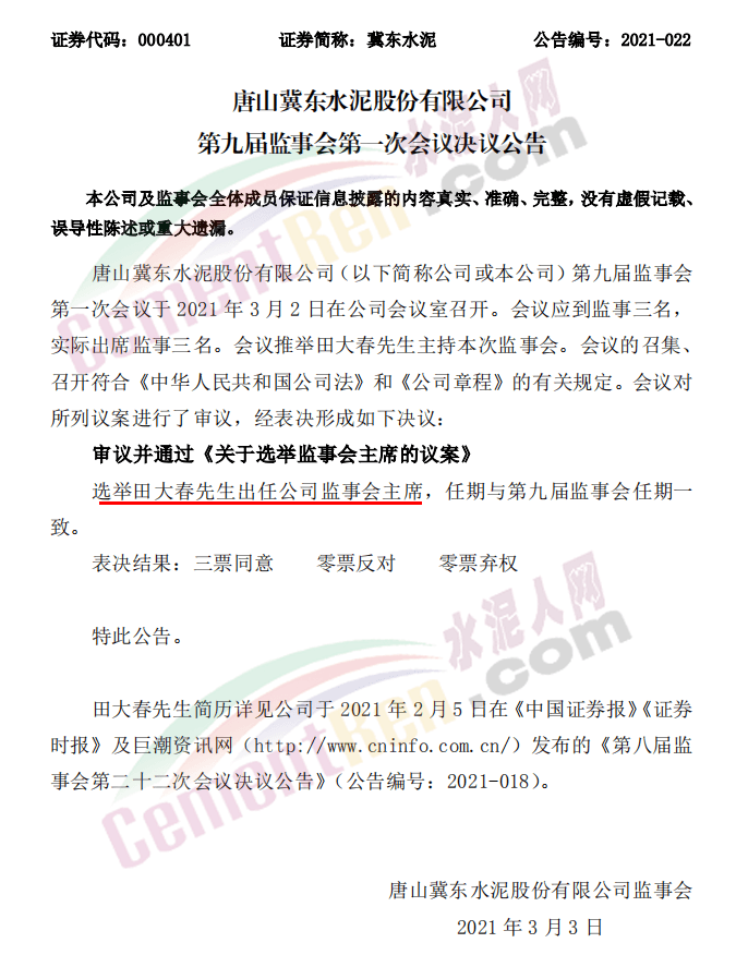 3月2日晚間唐山冀東水泥上市公司連發五條公告,內容為董事長、總經理、監事會主席,以及其他高級管理人員的選舉及任命。