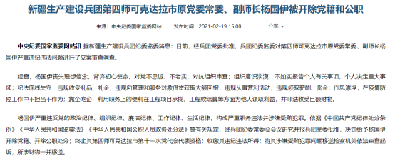 2月19日,中央紀委國家監委網站發布要聞消息《新疆生產建設兵團第四師可克達拉市原黨委常委、副師長楊國伊被開除黨籍和公職》。