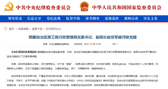 1月8日,中央紀委國家監委網站消息《西藏自治區原工商行政管理局黨委書記、副局長趙世軍被開除黨籍》。