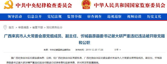 2019年12月20日,中央紀委國家監委網站消息《廣西來賓市人大常委會原黨組成員、副主任、忻城縣原縣委書記謝大研嚴重違紀違法被開除黨籍和公職》。