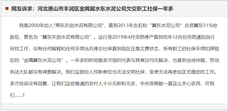日前,有網(wǎng)友在河北新聞網(wǎng)陽(yáng)光理政平臺(tái)上留言表示自己原是冀東灰劍水泥有限公司員工,后因企業(yè)停產(chǎn),要求其另行找工作,目前社保手續(xù)被扣押,無法繼續(xù)交納社保,故而求助相關(guān)部門。