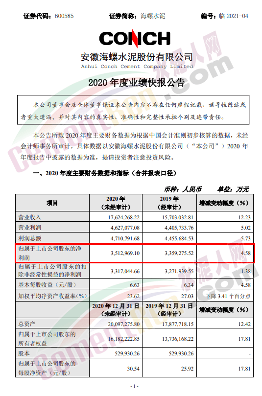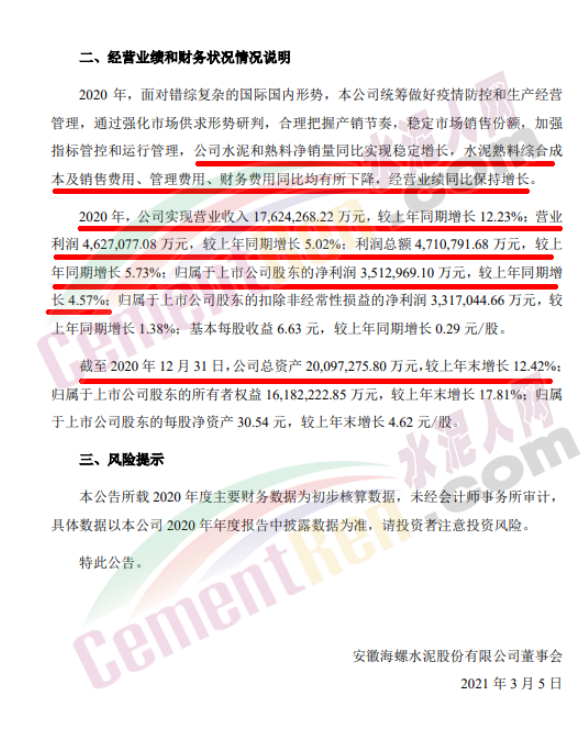 2020 年,面對錯綜復雜的國際國內形勢,海螺水泥公司統籌做好疫情防控和生產經營 管理,通過強化市場供求形勢研判,合理把握產銷節奏,穩定市場銷售份額,加強指標管控和運行管理,公司水泥和熟料凈銷量同比實現穩定增長,水泥熟料綜合成 本及銷售費用、管理費用、財務費用同比均有所下降,經營業績同比保持增長。