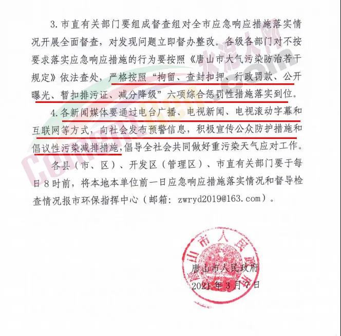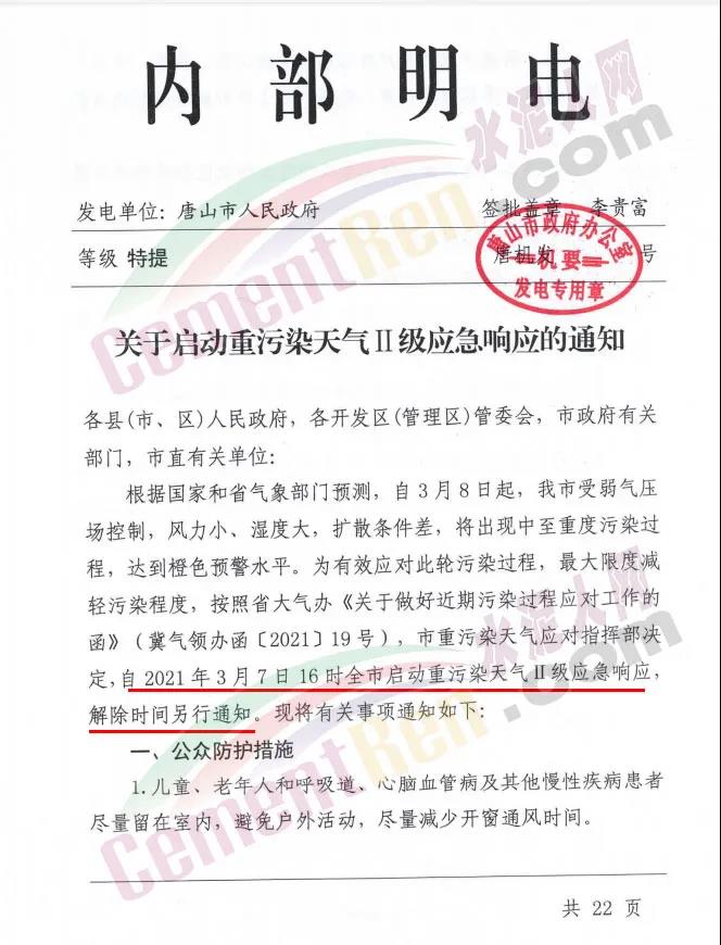 日前,唐山市人民政府發(fā)布特提文件《關(guān)于啟動重污染天氣級應(yīng)急響應(yīng)的通知》:要求自2021年3月7日16時全市啟動重污染天氣Ⅱ級應(yīng)急響應(yīng),解除時間另行通知。水泥、鋼鐵、焦化等企業(yè)執(zhí)行強制性減排措施: