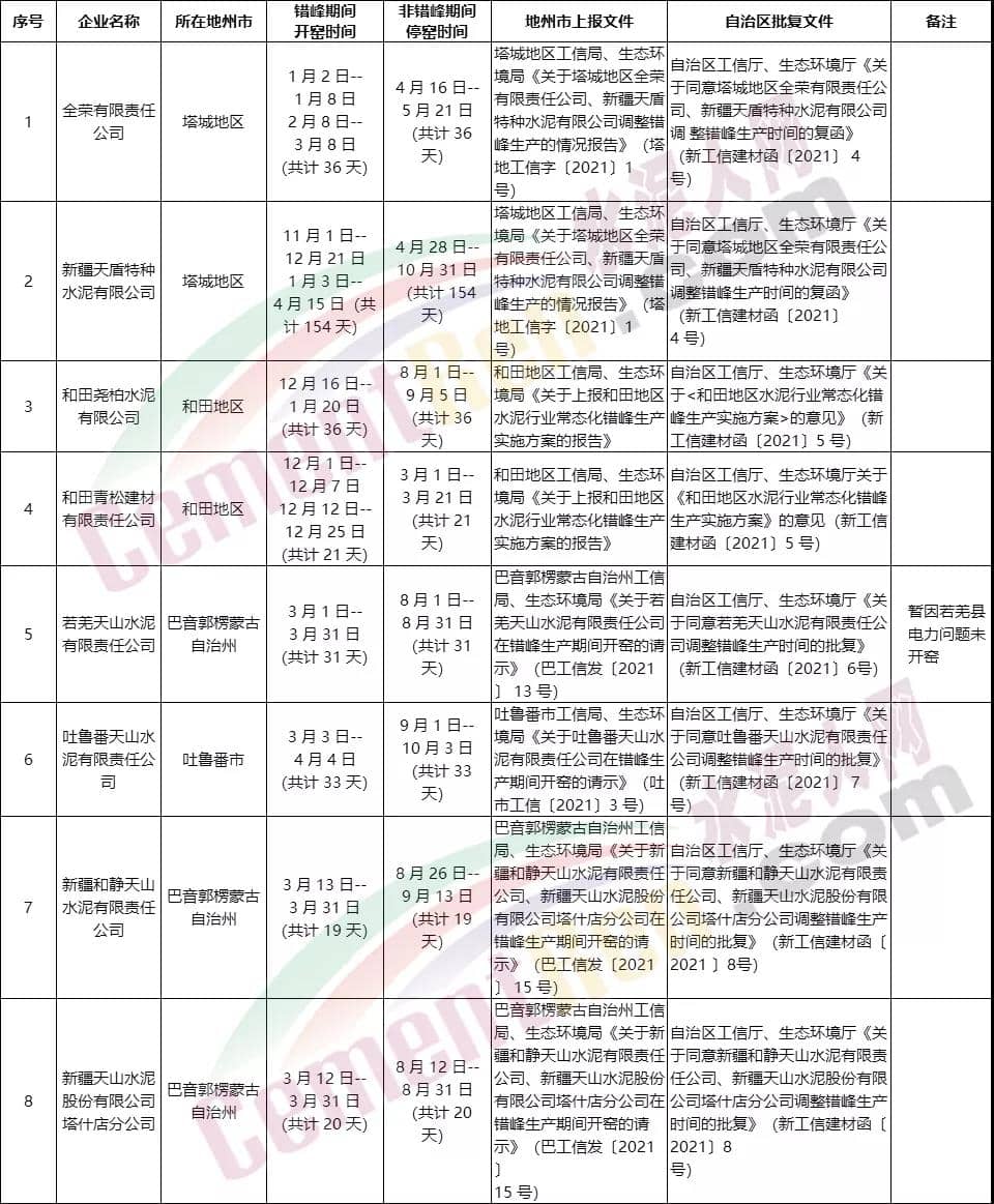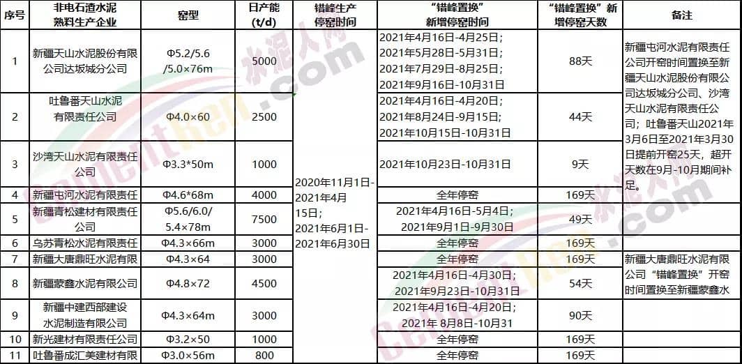 日前,新疆維吾爾自治區工業和信息化廳發布《關于對2020-2021年新疆水泥企業調整錯峰生產時間及電石渣水泥企業錯峰置換情況的公告》。