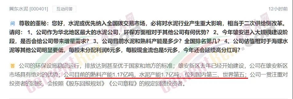 日前,有投資者向冀東水泥提問:作為華北地區(qū)最大的水泥公司,環(huán)保方面相對(duì)于其他公司有何優(yōu)勢?今年雄安進(jìn)入大規(guī)模建設(shè)階段,是否會(huì)給公司帶來增量需求?公司目前水泥和熟料產(chǎn)能是多少?全國排名第幾?