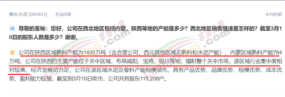 另有投資者提問關(guān)于西北地區(qū)的內(nèi)蒙和陜西產(chǎn)能,冀東水泥上市公司回復(fù)稱, 公司在陜西區(qū)域熟料產(chǎn)能為1400萬噸(含合營公司,西北其他區(qū)域無熟料和水泥產(chǎn)能)、內(nèi)蒙區(qū)域熟料產(chǎn)能784萬噸;