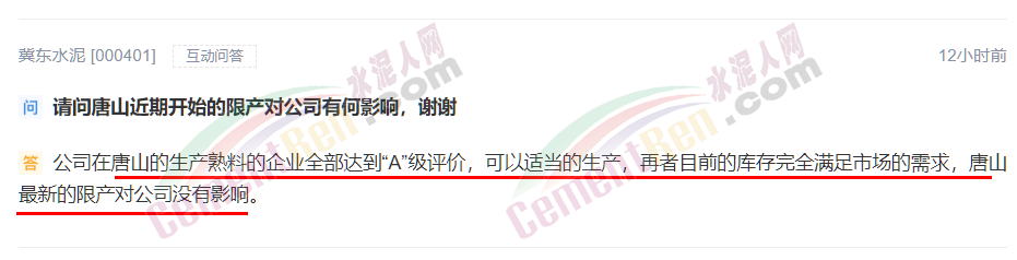 冀東水泥回復(fù)稱,公司在唐山的生產(chǎn)熟料的企業(yè)全部達(dá)到“A”級(jí)評(píng)價(jià),可以適當(dāng)?shù)纳a(chǎn),再者目前的庫存完全滿足市場的需求,唐山最新的限產(chǎn)對(duì)公司沒有影響。