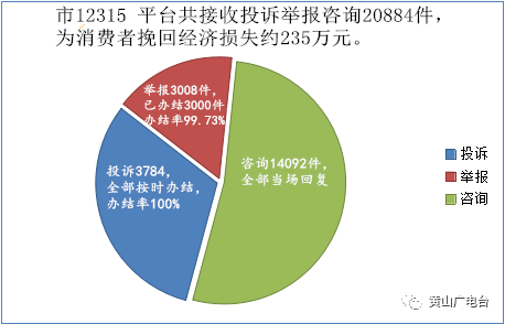 2020年,黃山市12315 平臺(tái)共接收投訴舉報(bào)咨詢20884件,為消費(fèi)者挽回?fù)p失235萬元。