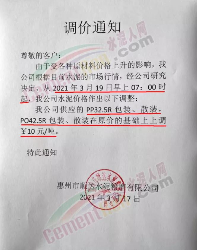 華南珠三角區域主要品牌企業熟料預上調20元/噸,水泥價格或應聲而漲。日前,惠州市順達水泥粉磨有限公司通知,由于受各種原材料價格上升的影響,公司研究決定從2021年3月19日早上7時起,公司供應的 PP32.5R包裝、散裝,PO42.5R包裝、散裝在原價的基礎上上調10 元/噸。