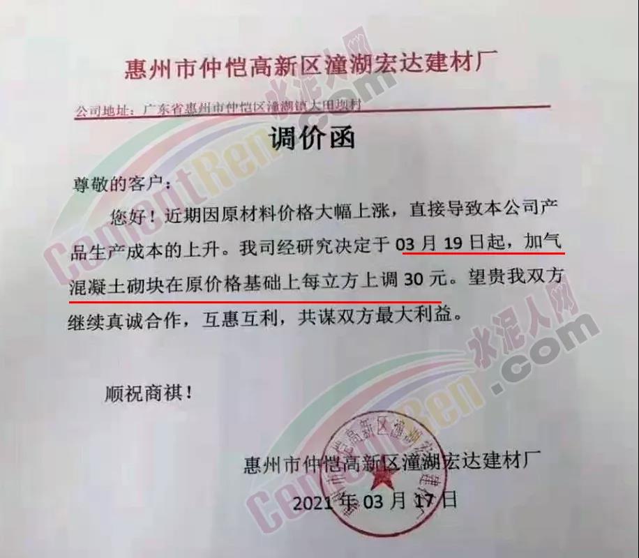 同日,惠州區域多家混凝土加氣磚廠陸續通知上調產品價格30元/立方。惠州市仲愷高新區潼湖宏達建材廠公司通知,因原材料價格大幅上漲,直接導致公司產品生產成本的上升。經研究決定于3月19 日起,加氣混凝土砌塊在原價格基礎上上調 30元/立方。