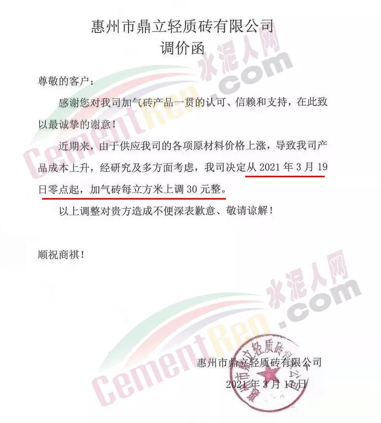 惠州市鼎立輕質磚有限公司通知,由于供應我司的各項原材料價格上漲,導致公司產品成本上升,經研究及多方面考慮,決定從2021年3月19日零點起,加氣磚上調 30 元/立方。