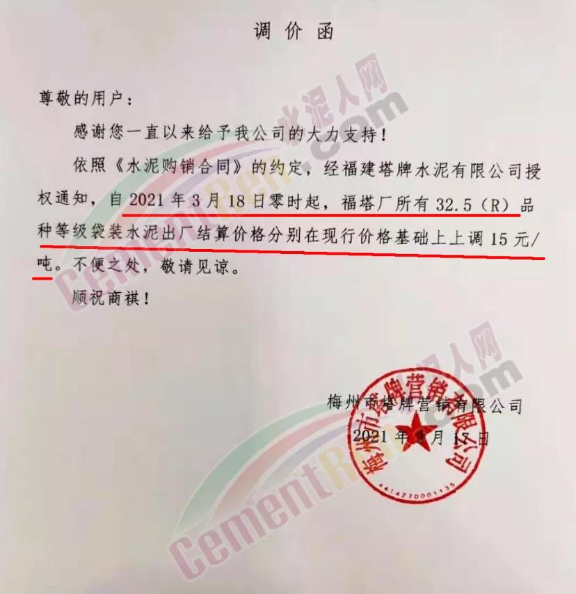 梅州市塔牌營銷有限公司通知,自3月18日零時起,福塔廠所有32.5(R)品種等級袋裝水泥出廠結算價格分別 在現行價格基礎上上調15元/噸。
