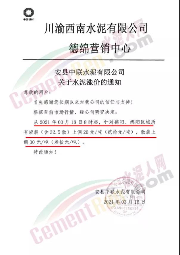 西南區域主要品牌企業也陸續發布調價通知,多企業表示近期以“復價增量”為主。中國建材川渝西南水泥有限公司德綿營銷中心安縣中聯水泥有限公司水泥漲價通知稱,從2021年03月18日8時起,針對德陽、綿陽區域所有袋裝(含32.5散)上調20元/噸,散裝上調30元/噸。
