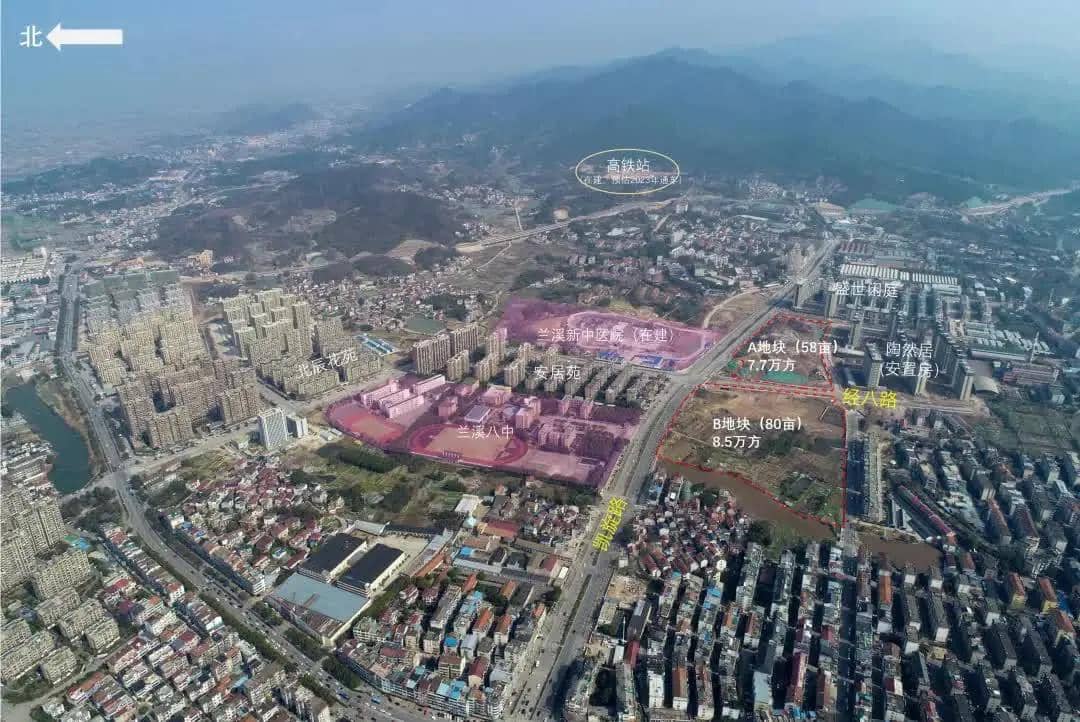 凱旋路南側的兩個地塊,現有配套有蘭八中、城北小學,正在建設的有張山雷中醫藥文化研究中心,也就是蘭溪市中醫院的遷建工程,就在馬路對面。凱旋路區塊還有一個賣點是高鐵小鎮,這是核心優勢。上述兩個地塊距離在建的高鐵蘭溪東站(化里村)不到3公里。交通區位優勢、優質教育資源配置、完善生活設施配套……眾多優質資源加持,讓凱旋路區塊成為蘭城矚目地段。