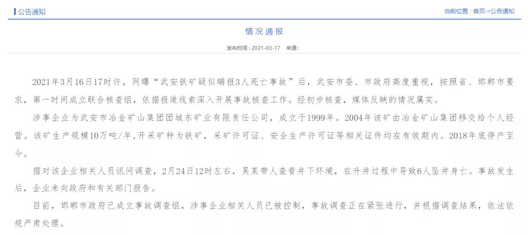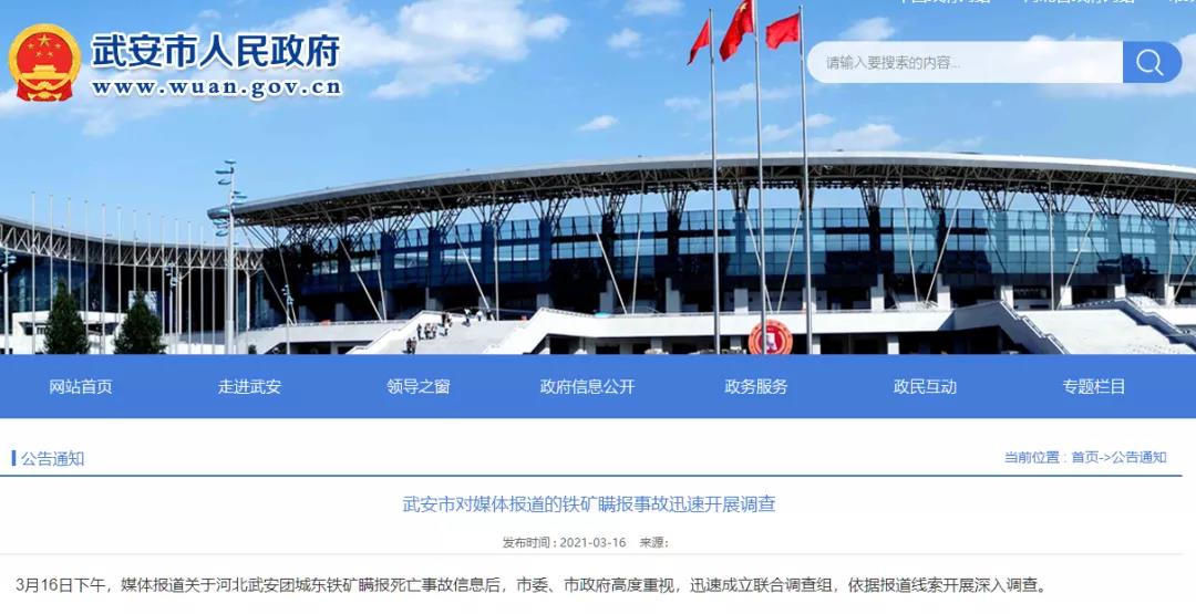 據武安市人民政府網站17日消息,2021年3月16日17時許,網曝“武安鐵礦疑似瞞報3人死亡事故”后,武安市委、市政府高度重視,按照省、邯鄲市要求,第一時間成立聯合核查組,依據報道線索深入開展事故核查工作。經初步核查,媒體反映的情況屬實。