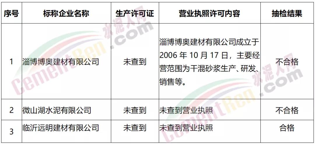 不合格的18家企業(yè)中兩家企業(yè)未查到生產(chǎn)許可證,其中微山湖水泥有限公司甚至查不到營業(yè)執(zhí)照。同時(shí),在抽樣檢驗(yàn)合格的企業(yè)中,水泥質(zhì)量萬里行組委會發(fā)現(xiàn)1家無證生產(chǎn)企業(yè),2家生產(chǎn)許可證已過有效期(來源生產(chǎn)許可證辦公室,以實(shí)際證書為準(zhǔn))。
