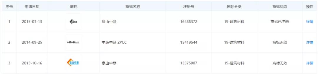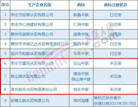從不合格水泥品牌列表可見有9家企業(yè)為“高仿品牌”水泥。8家企業(yè)商標(biāo)均帶有“中聯(lián)”字樣,其中5家商標(biāo)狀態(tài)為已注冊3家未注冊。雖注冊為“中聯(lián)”卻非中國聯(lián)合水泥集團(tuán)有限公司下屬企業(yè)。另一家企業(yè)商標(biāo)中帶有“海螺”字樣,商標(biāo)為申請注冊過程中,申請日期為上周三(2021年3月10日)也非安徽海螺水泥股份有限公司下屬企業(yè)。