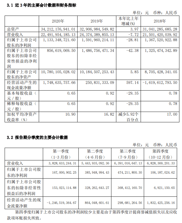 日前,中材國際(600970.SH)2020年年度報告,實現(xiàn)營業(yè)收入224.92億元,同比減少7.72%;歸屬于上市公司股東的凈利潤11.33億元,同比減少28.81%;歸屬于上市公司股東的扣除非經(jīng)常性損益的凈利潤8.57億元,同比下降42.38%;基本每股收益0.65元,擬每10股派發(fā)現(xiàn)金紅利2.3元(含稅)。