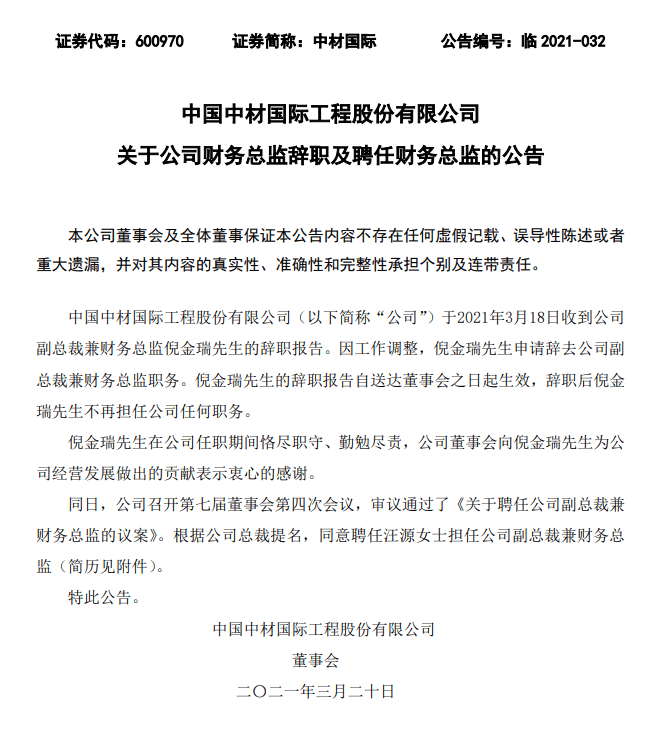根據(jù)公告,公司于2021年3月18日收到公司副總裁兼財務(wù)總監(jiān)倪金瑞的辭職報告。因工作調(diào)整,倪金瑞申請辭去公司副總裁兼財務(wù)總監(jiān)職務(wù)。倪金瑞的辭職報告自送達董事會之日起生效,辭職后倪金瑞不再擔(dān)任公司任何職務(wù)。