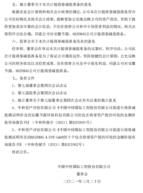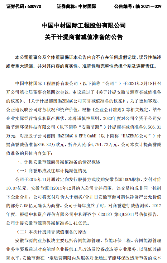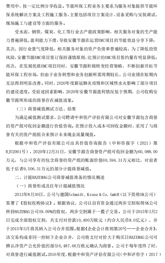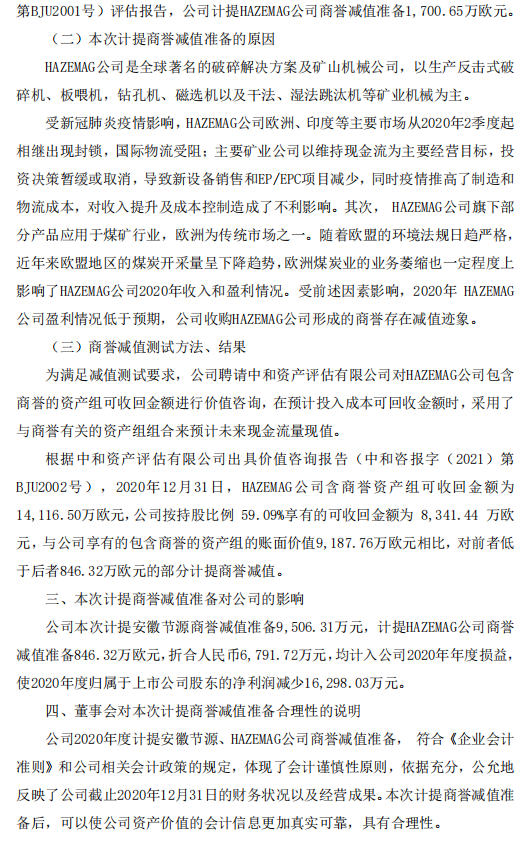 公司同期公告,公司對全資子公司安徽節(jié)源環(huán)保科技有限公司(“安徽節(jié)源”)計提商譽減值準備9506.31萬元,對控股子公司德國HAZEMAG EPR GmbH(“HAZEMAG公司”)計提商譽減值準備846.32萬歐元,折合人民幣6791.72萬元,均計入公司2020年年度損益,使2020年度歸屬于上市公司股東的凈利潤減少1.63億元。