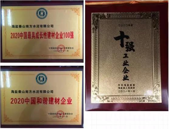 海鹽秦山南方水泥有限公司曾先后獲得海鹽工業十強企業、工業納稅三十強企業、中國最具成長性建材企業和中國和諧建材企業等榮譽。