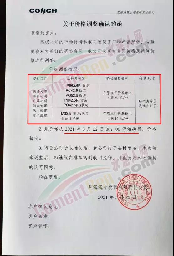 昨日(3月22日),珠海海中貿易有限公司通知英德海螺 、清新公司、廣英公司、陽春海螺、佛山海螺、江門海螺等工廠船運離岸和汽運出廠價高標號散裝水泥在原執行價格基礎上上調30元/噸,M32.5全品種在原執行價格基礎上上調10元/噸。