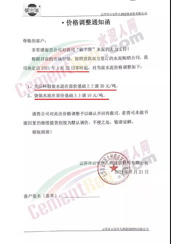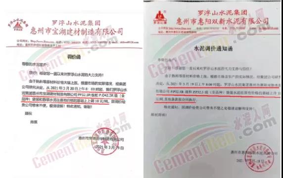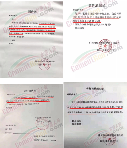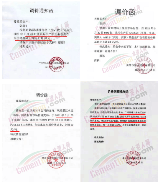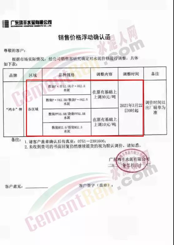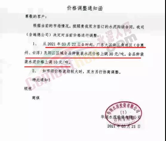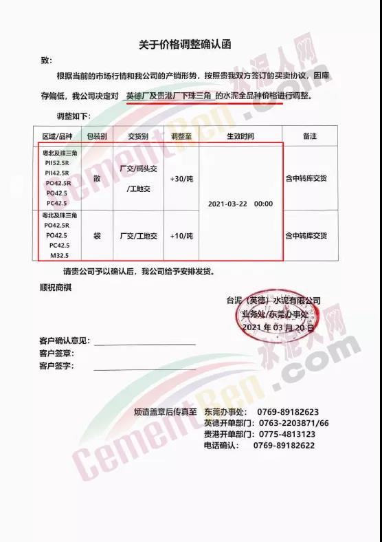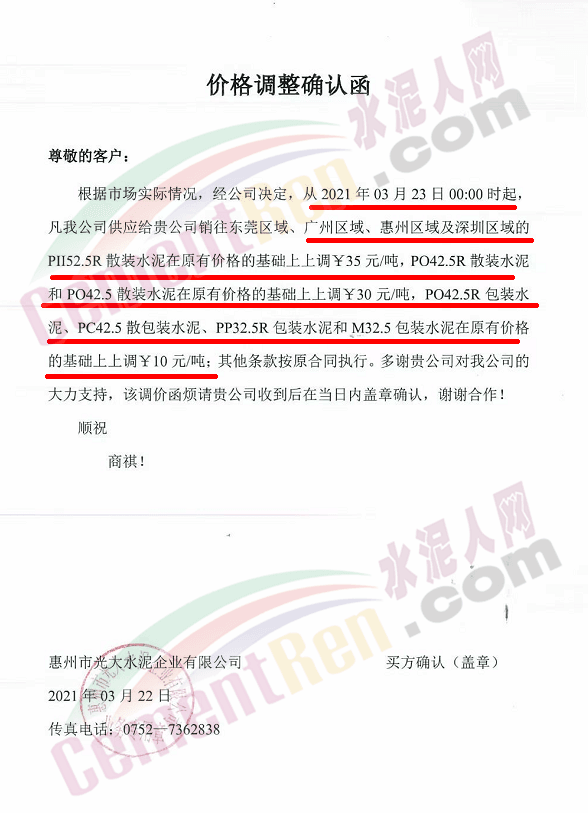 惠州市光大水泥通知,根據市場實際情況,經公司決定,從2021年03月23日零時起,公司銷往東莞區域、廣州區域、惠州區域及深圳區域的 PII52.5R散裝水泥在原有價格的基礎上上調35元/噸,PO42.5R散裝水泥和PO42.5散裝水泥在原有價格的基礎上上調30元/噸,PO42.5R包裝水泥、PC42.5 散包裝水泥、PP32.5R包裝水泥和M32.5包裝水泥在原有價格的基礎上上調10元/噸;其他條款按原合同執行。