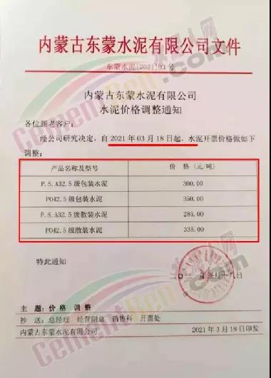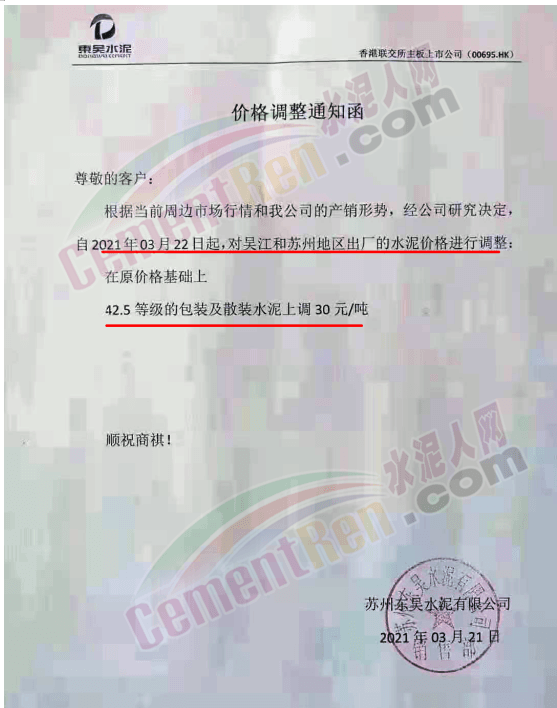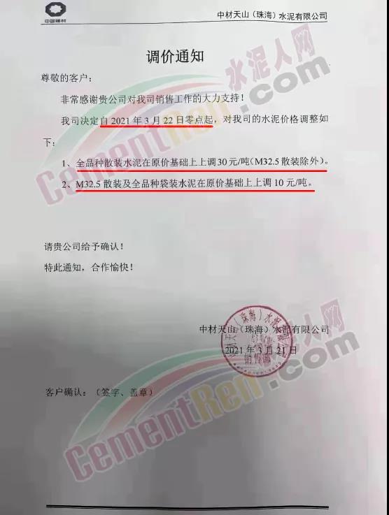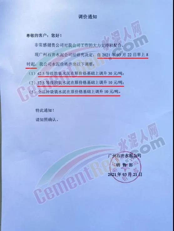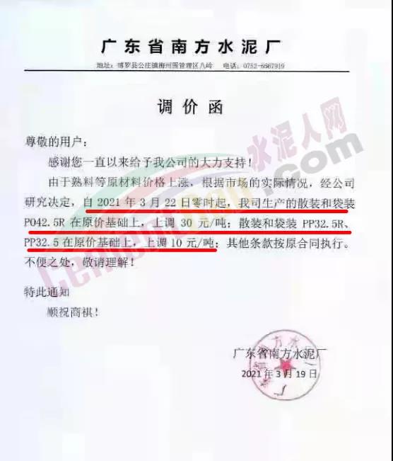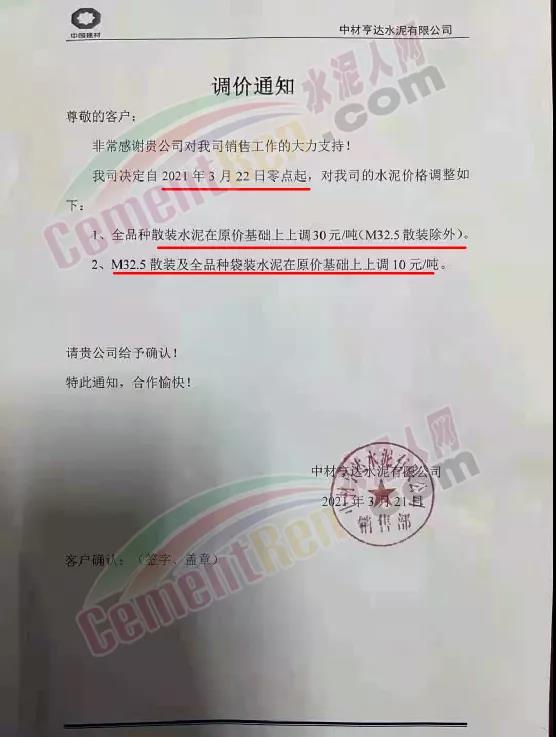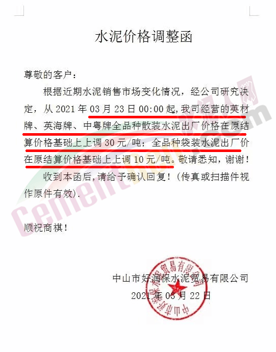 中山市好潤保水泥貿易有限公司通知,從2021年03月23日零時起,公司經營的英材牌、英海牌、中粵牌全品種散裝水泥出廠價格在原結算價格基礎上上調 30元/噸;全品種袋裝水泥出廠價在原結算價格基礎上上調 10元/噸。