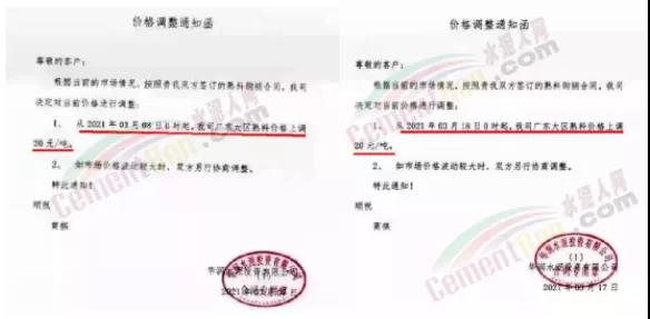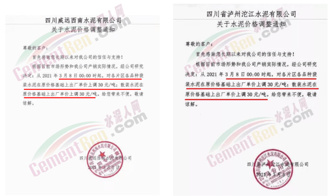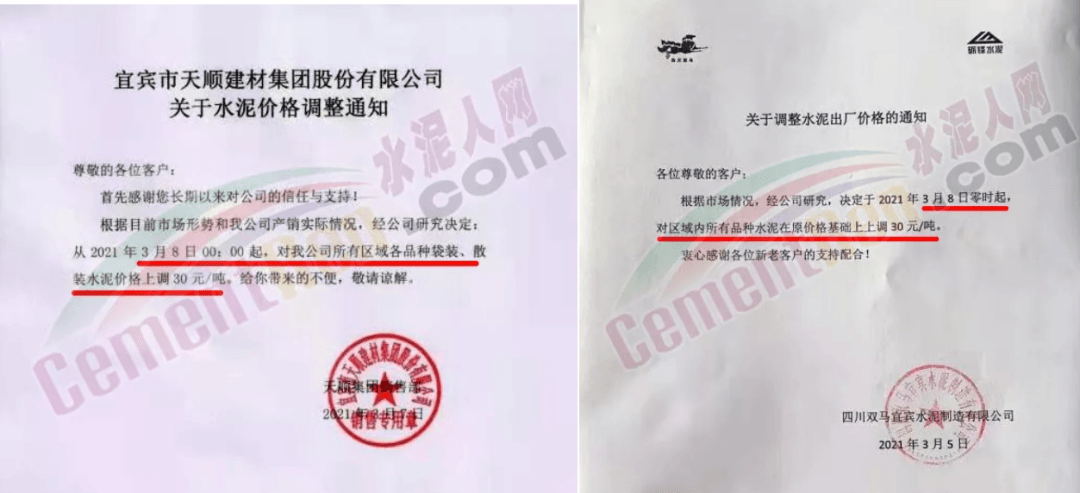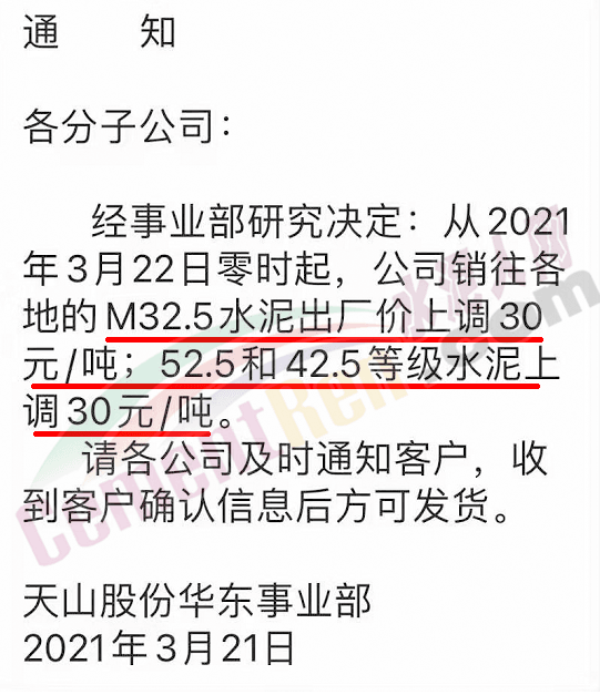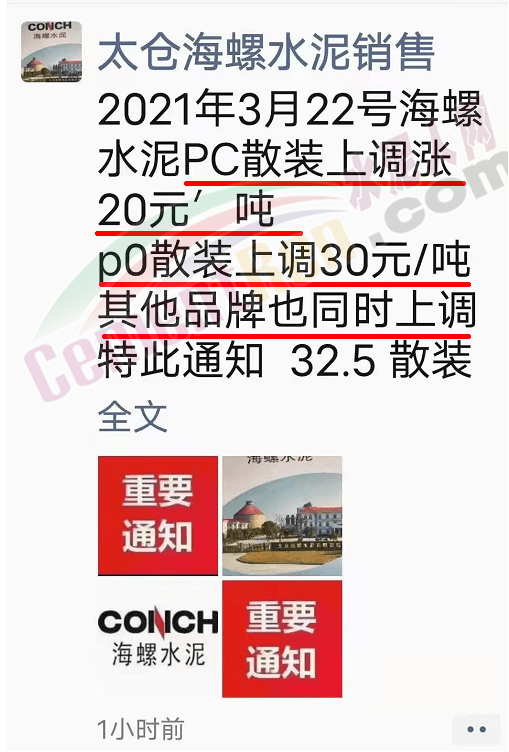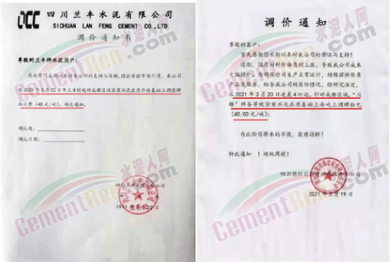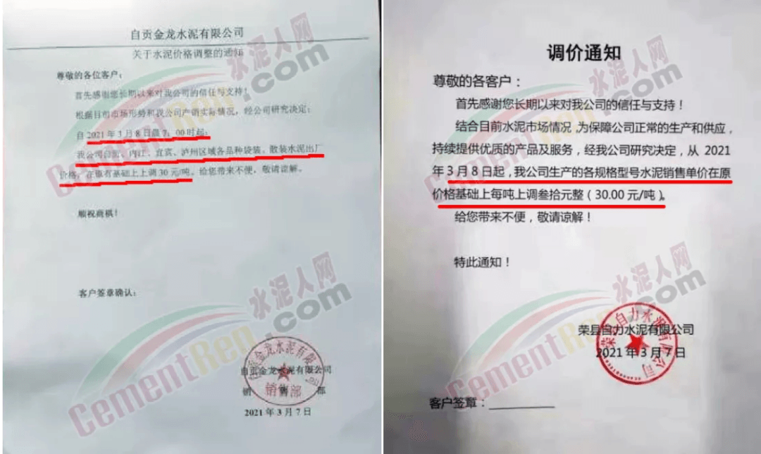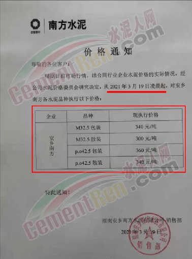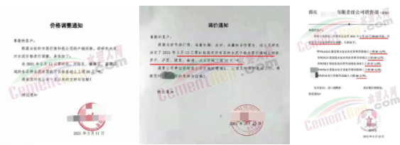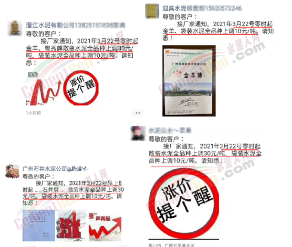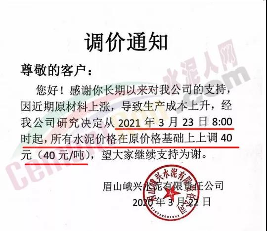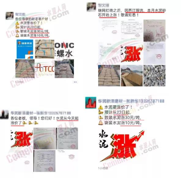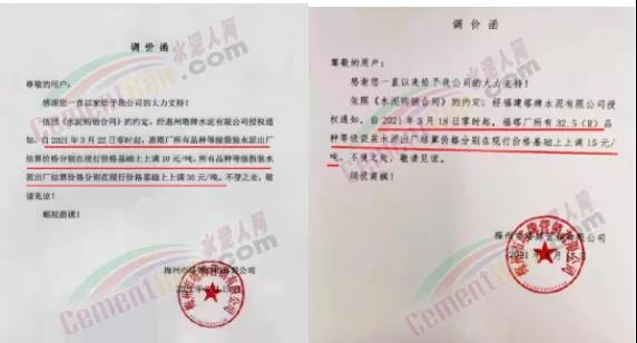 同時,下游經銷商也集體發通知告知客戶水泥漲價的消息。