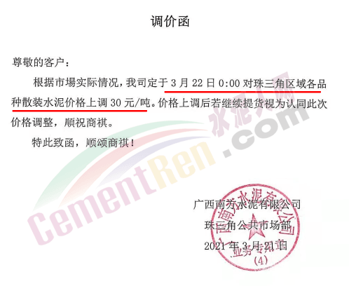 廣西南方通知自3月22日起對珠三角區域各品種散裝水泥上調30元/噸。