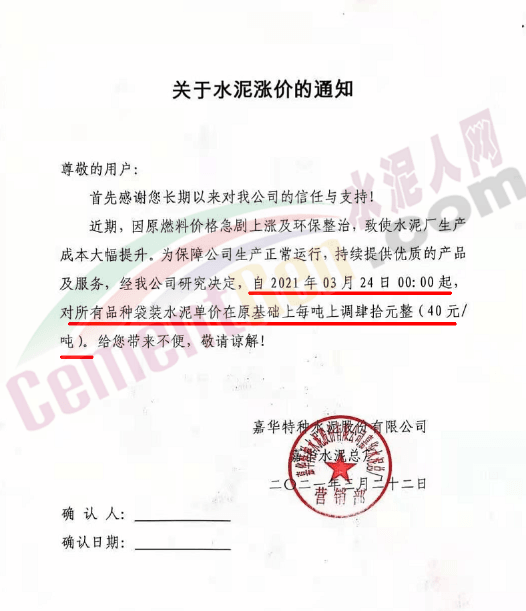 嘉華特種水泥股份有限公司通知自3月24日0時起上調所有品種袋裝水泥價格40元/噸。