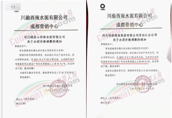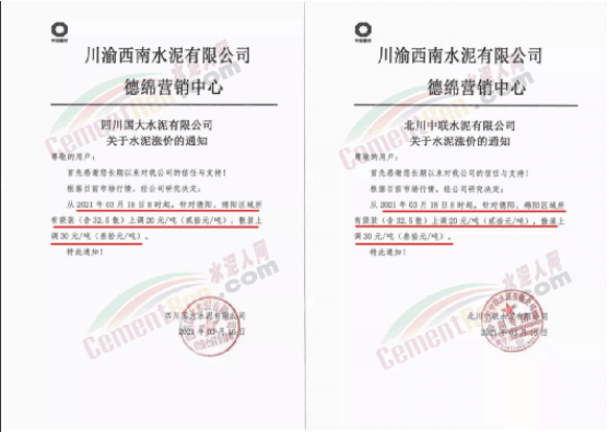 其中,渝西南水泥成都營銷中心下屬四川省女媧建材有限公司、四川利森建材集團青白江分公司、四川峨眉山西南水泥通知自3月20日零點起,大成都區域所有袋裝系列水泥出廠單價在原基礎上上調40元/噸;