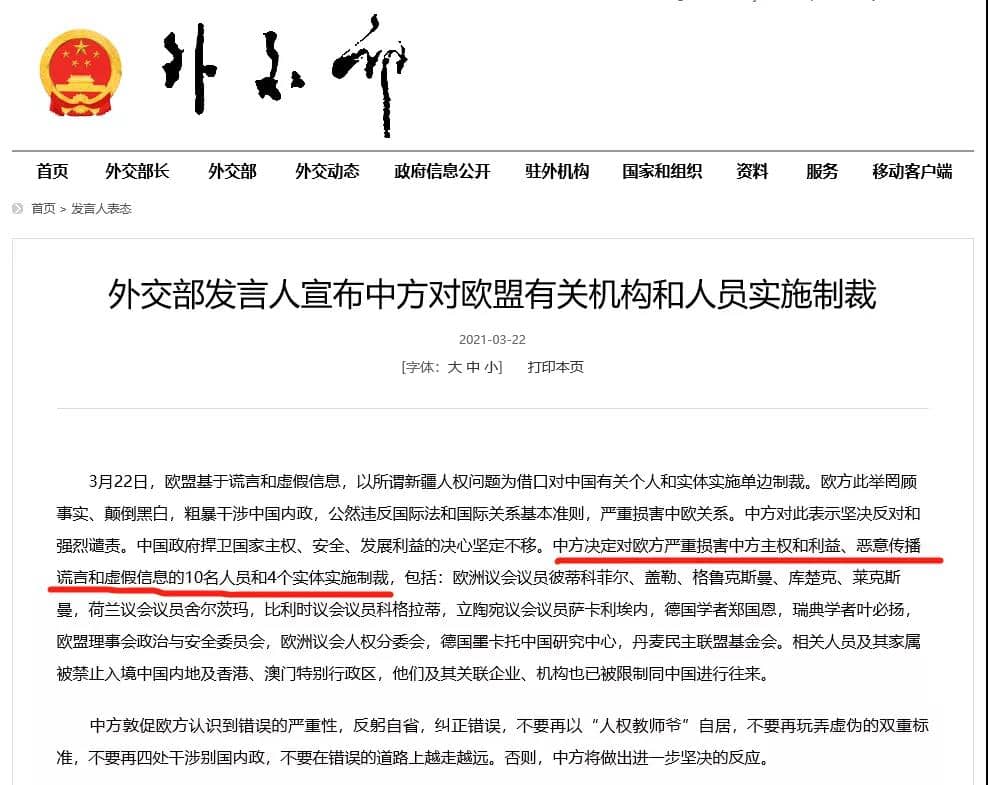 中方決定對歐方嚴重損害中方主權和利益、惡意傳播謊言和虛假信息的10名人員和4個實體實施制裁,包括:歐洲議會議員彼蒂科菲爾、蓋勒、格魯克斯曼、庫楚克、萊克斯曼,荷蘭議會議員舍爾茨瑪,比利時議會議員科格拉蒂,立陶宛議會議員薩卡利埃內,德國學者鄭國恩,瑞典學者葉必揚,歐盟理事會政治與安全委員會,歐洲議會人權分委會,德國墨卡托中國研究中心,丹麥民主聯盟基金會。相關人員及其家屬被禁止入境中國內地及香港、澳門特別行政區,他們及其關聯企業、機構也已被限制同中國進行往來。