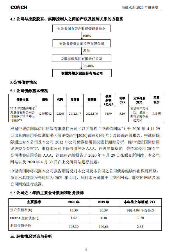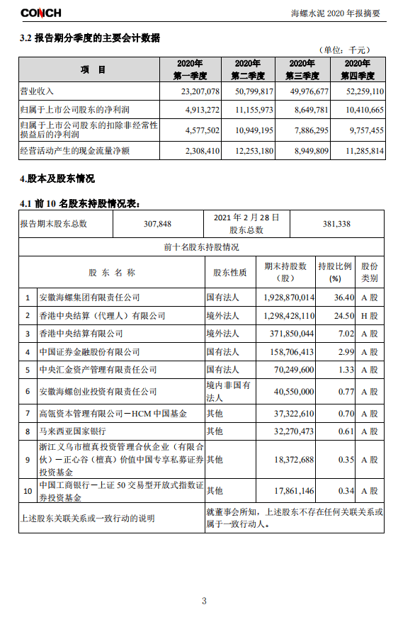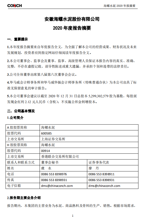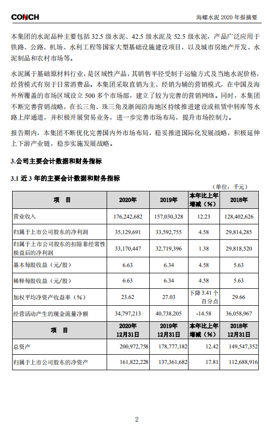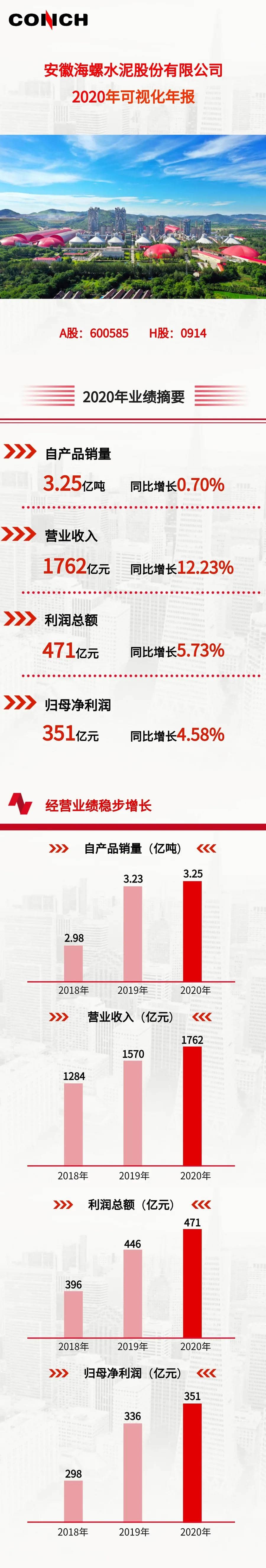 海螺水泥(600585)25日晚間發布年報,2020年實現營業總收入1762.43億元,同比增長12.23%;歸屬母公司股東凈利潤351.3億元,同比增長4.58%;基本每股收益為6.63元。
