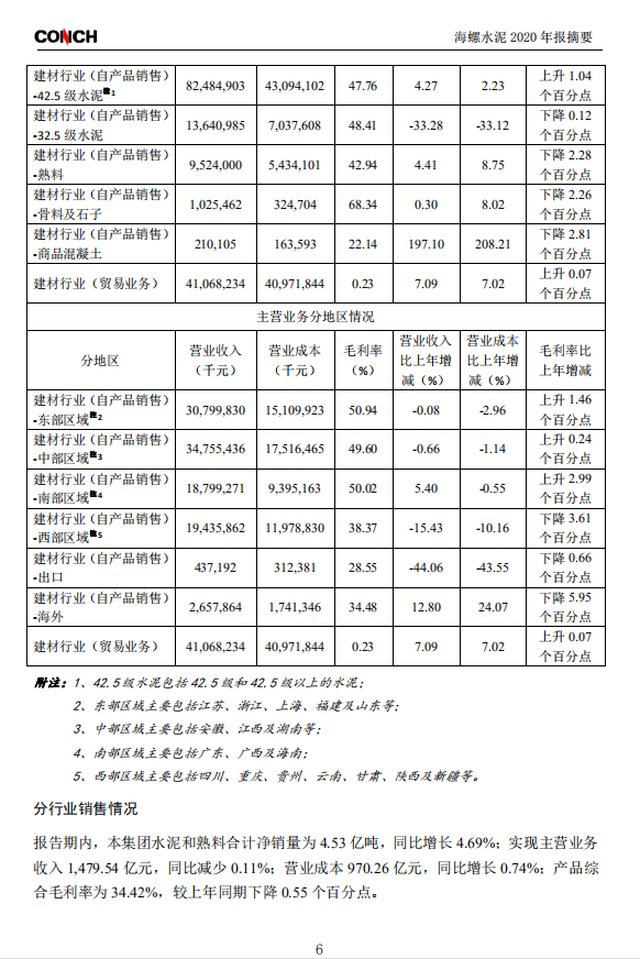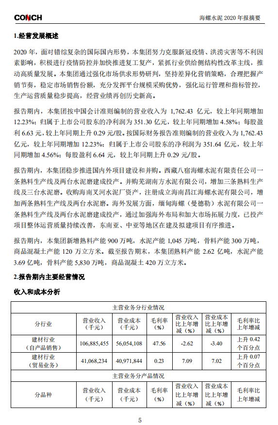 報告期內,本集團水泥和熟料合計凈銷量為4.53億噸,同比增長4.69%;實現主營業務收入1,479.54億元,同比減少0.11%;營業成本970.26億元,同比增長0.74%;產品綜合毛利率為34.42%,較上年同期下降0.55個百分點。