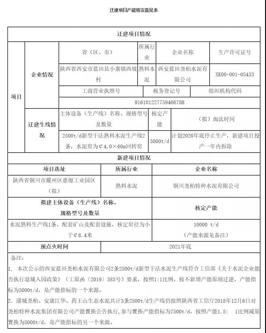 巨大社會貢獻(xiàn)及稅收,也伴隨著重污染。2019年11月,銅川市人民政府發(fā)布《關(guān)于西安藍(lán)田堯柏水泥有限公司2×2500t/d新型干法熟料水泥生產(chǎn)線遷建我市的公示》稱,確定藍(lán)田堯柏水泥廠將退城入園,入駐耀州區(qū)惠源工業(yè)園區(qū),預(yù)計(jì)在2021年底點(diǎn)火投產(chǎn),新項(xiàng)目投產(chǎn)舊項(xiàng)目即停產(chǎn),一年內(nèi)拆除。