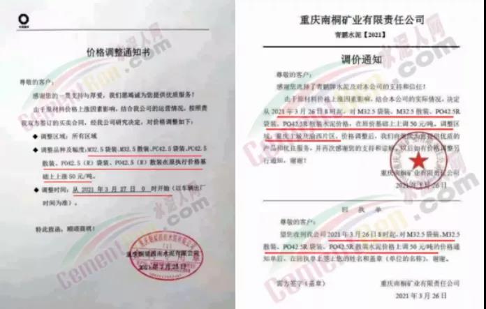 重慶市兩次調價,50多家水泥企業價格上調超100元/噸