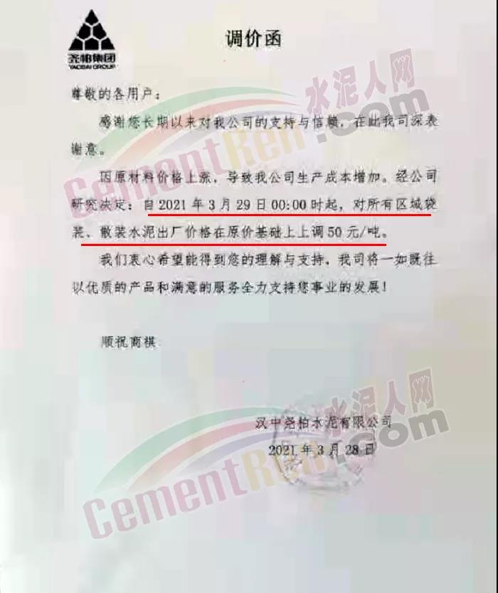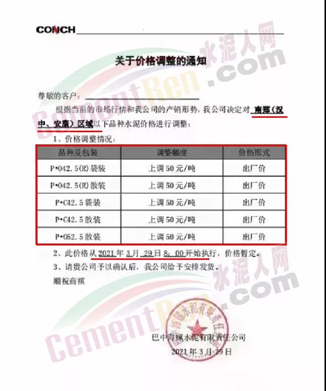 日前,巴中海螺水泥有限責任公司通知根據當前市場行情和公司的產銷形勢,自3月29日起對南效(漢中、安康)區域P.O42.5(R)和P.O52.5等標號包裝和散裝水泥出廠價上調50元/噸。