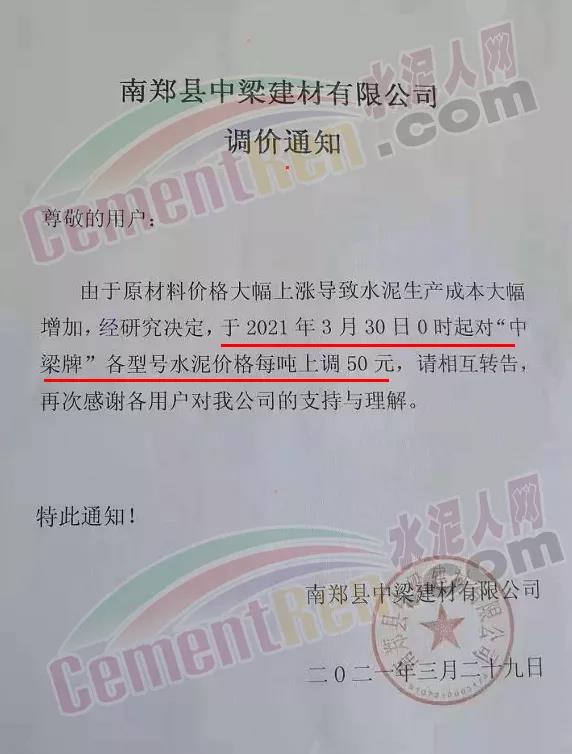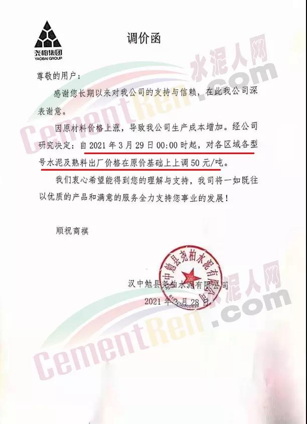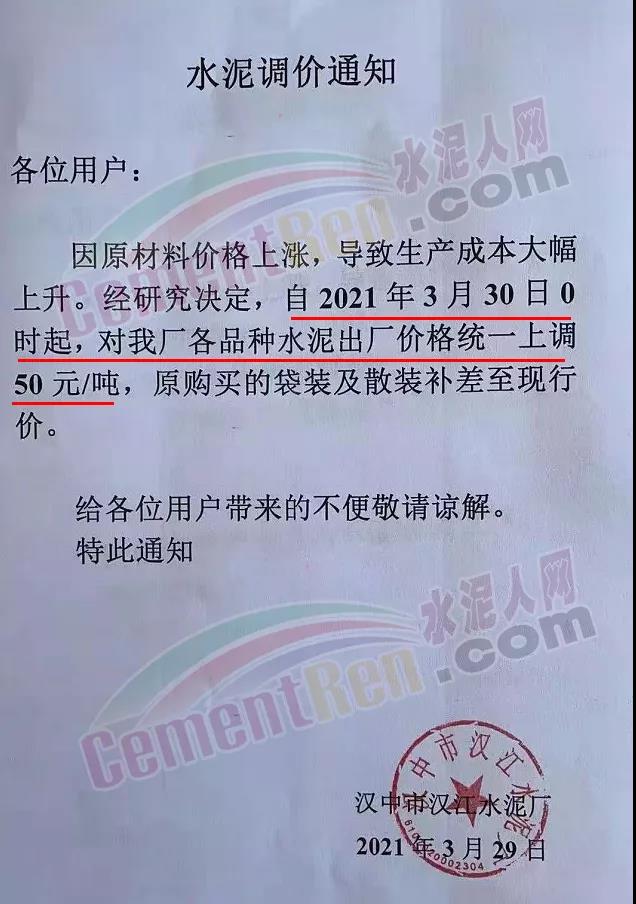 漢中堯柏水泥、漢中勉縣堯柏水泥、中材漢江水泥、漢中市漢江水泥廠、南郊縣中梁建材有限公司、漢中公路建材有限責任公司等多家品牌水泥企業通知,自29日起上調各標號水泥及熟料出廠價格50元/噸。