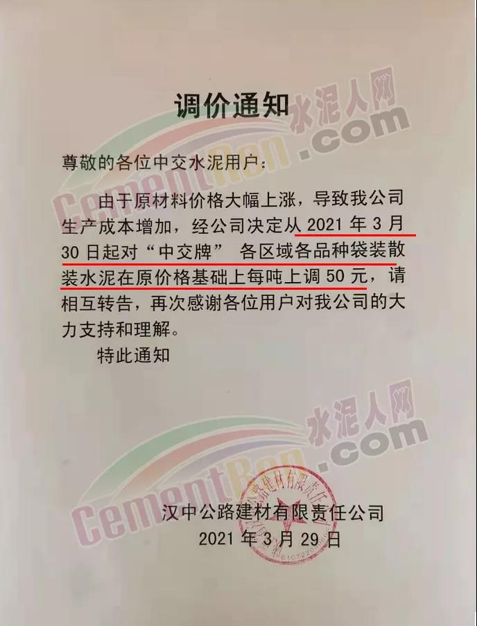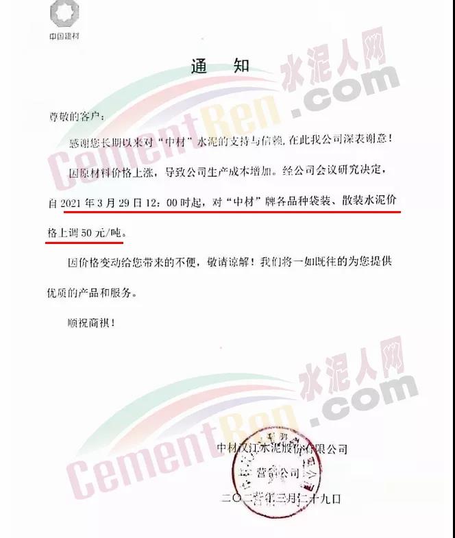 青?;ブ饒A水泥通知自3月29日起水泥價格上調60元/噸。