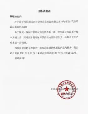北京金隅水泥經貿有限公司通知自3月26日起上調水泥出廠價格20元/噸。