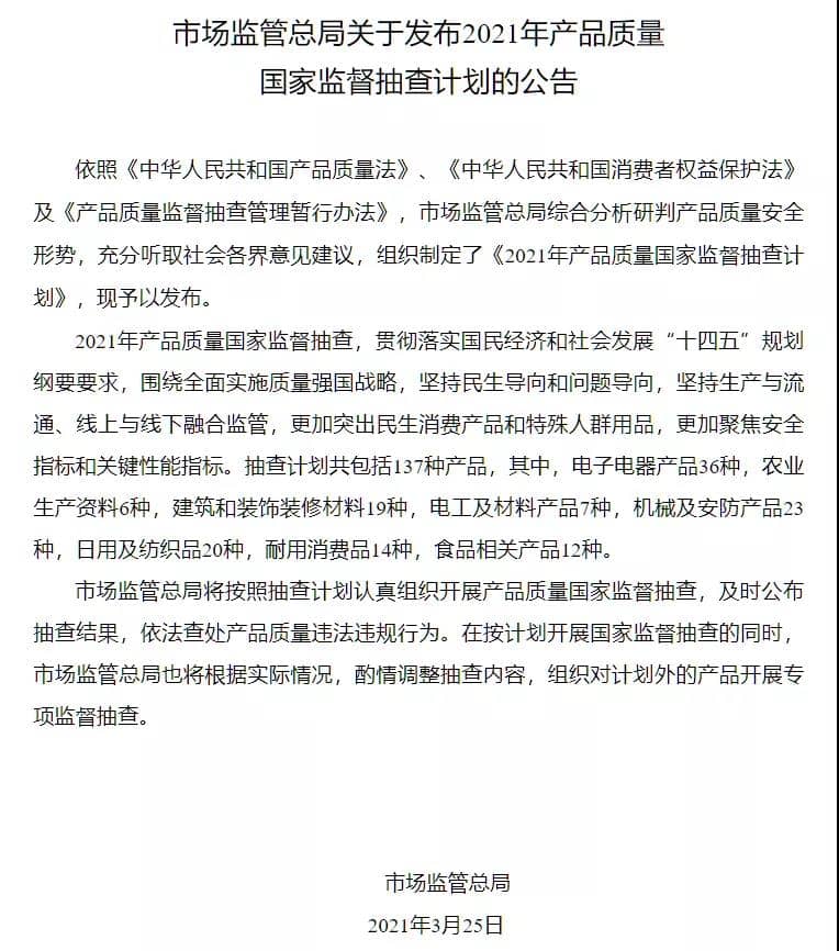 29日,市場監管總局發布了關于2021年產品質量國家監督抽查計劃的公告。公告顯示,《2021年產品質量國家監督抽查計劃》共涉及137種產品,其中,電子電器產品36種,農業生產資料6種,建筑和裝飾裝修材料包括水泥產品在內共19種,電工及材料產品7種,機械及安防產品23種,日用及紡織品20種,耐用消費品14種,食品相關產品12種。