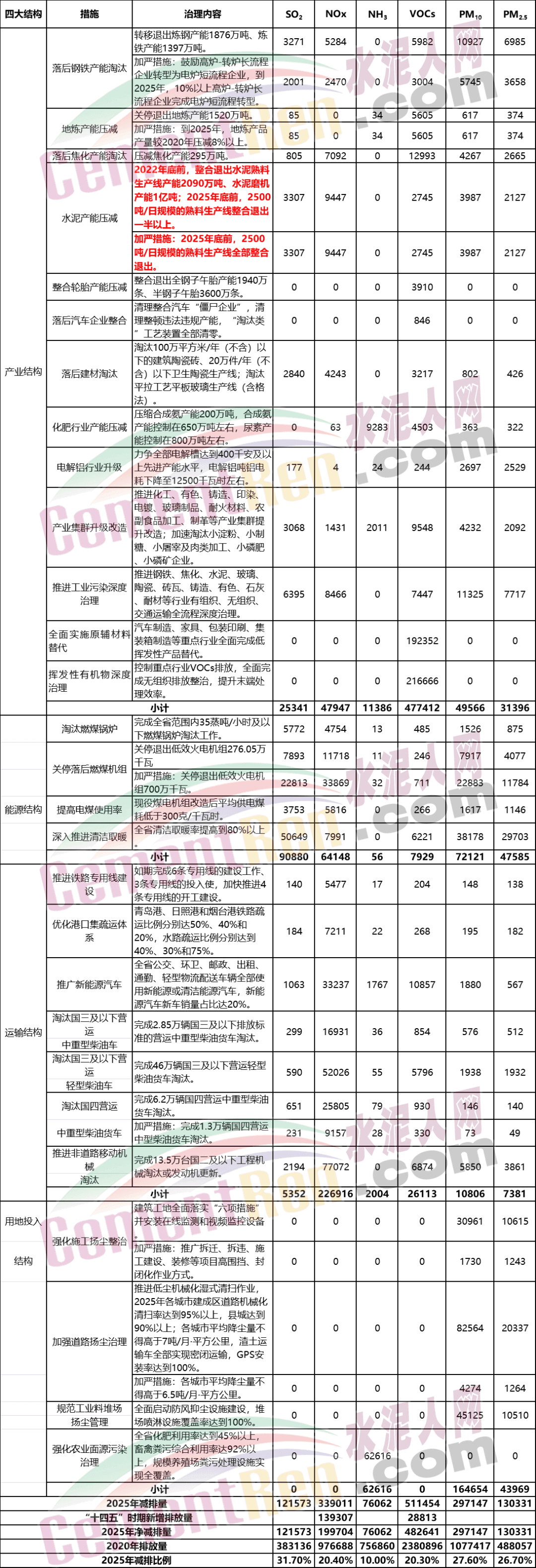 在全省區域內,按照PM2.5濃度每下降1μg/m3需減排17.3萬噸污染物,O3濃度每下降1μg/m3需減排7.0萬噸污染物,O3濃度下降需減排的VOCs和NOX基本包含在PM2.5減排的污染物削減中,不再單獨計算。為確保實現年度空氣質量目標,應減少大氣污染物排放34.6萬噸,需重點采取9大措施。