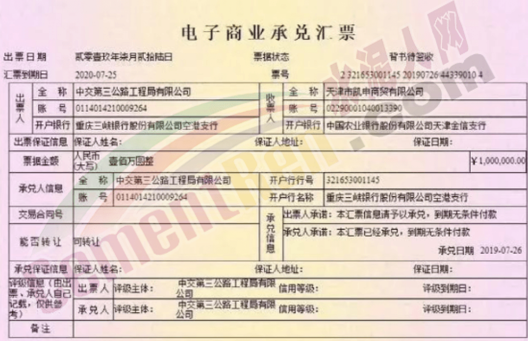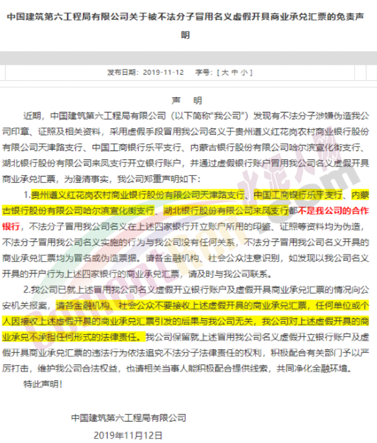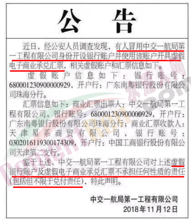 中交一航局第一工程限公司發聲明稱公司被人冒名開戶+開具虛假電子商票。公司對上述虛假銀行帳戶及虛假電子商業承兌匯票不承擔任何性質的責任。