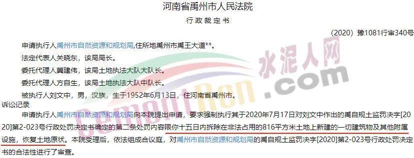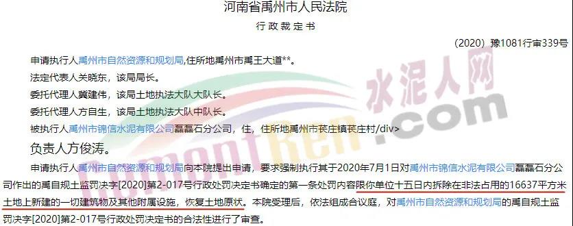 (2020)豫1081行審355號行政裁定書,準予執行禹州市自然資源和規劃局對被執行人禹州市錦信水泥有限公司磊磊石分公司作出的禹自規土監罰決字[2020]第2-025號行政處罰,決定書載明第一條處罰限你單位十五日內拆除在非法占用的11556平方米土地上新建的一切建筑物及其他附屬設施,恢復土地原狀。由禹州市自然資源和規劃局組織實施。