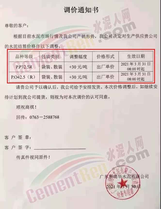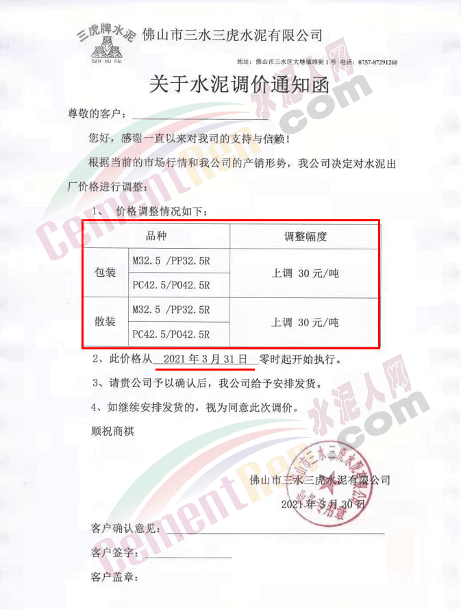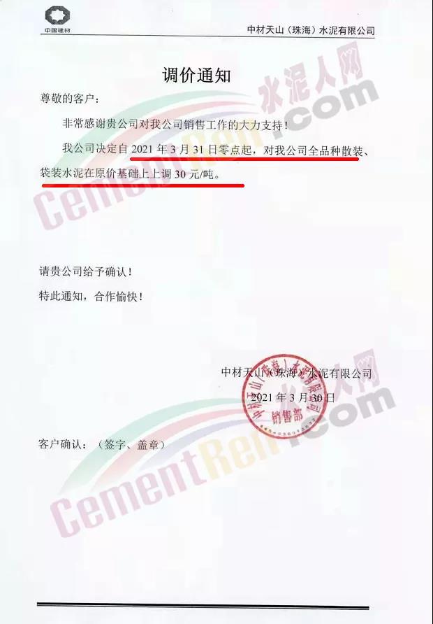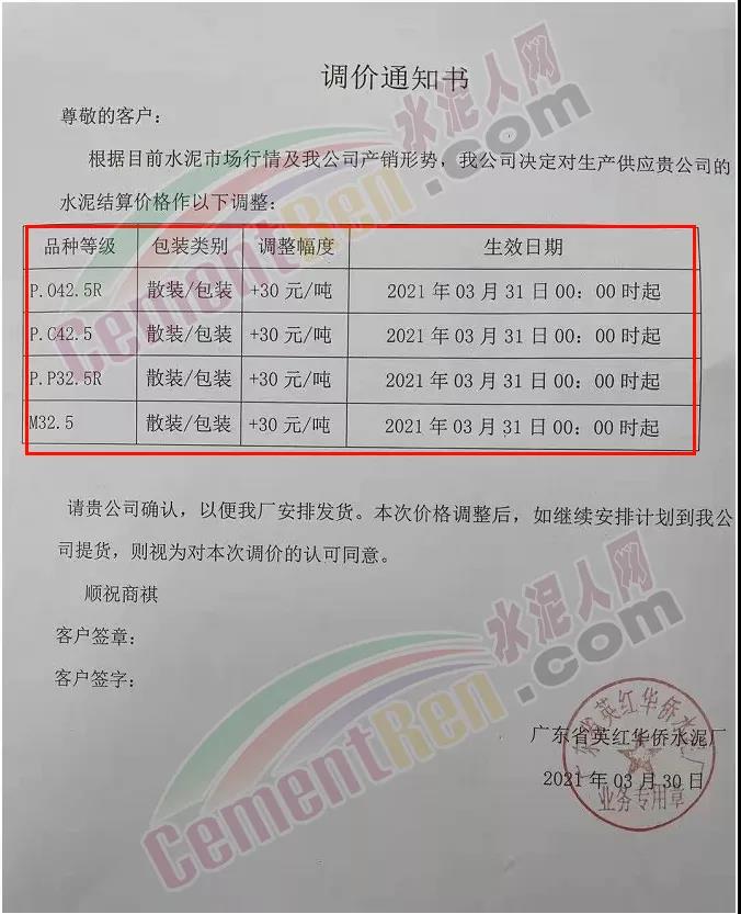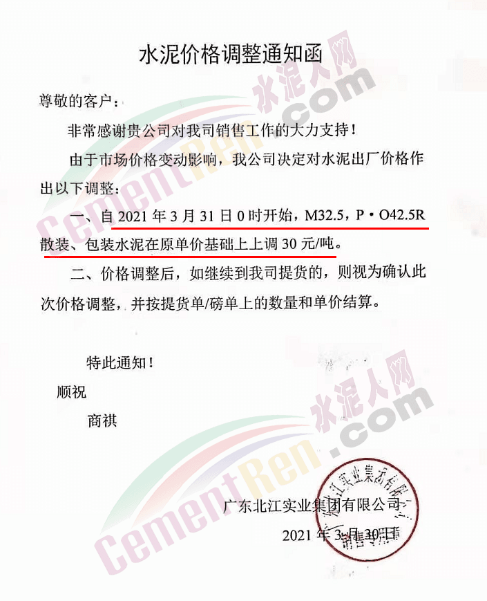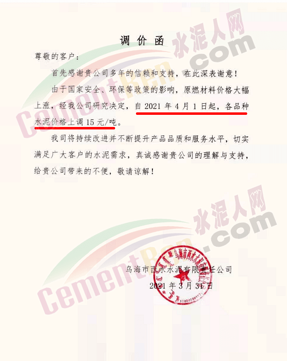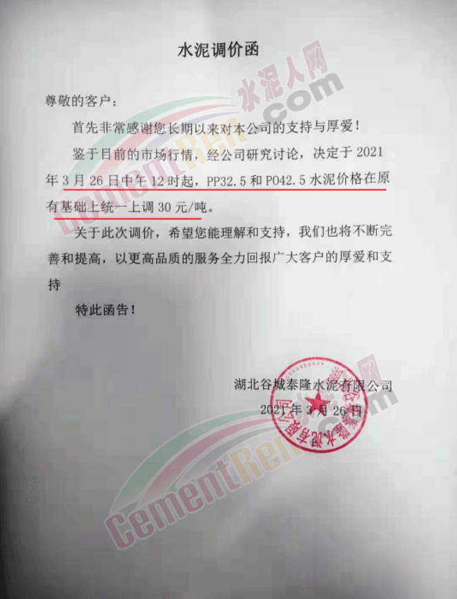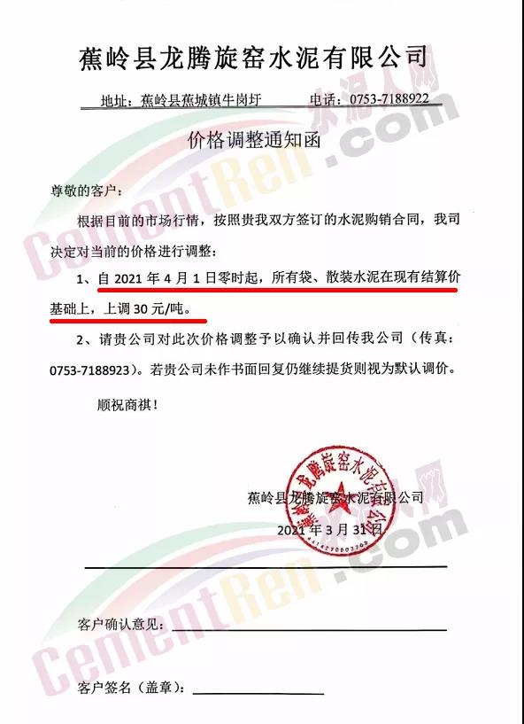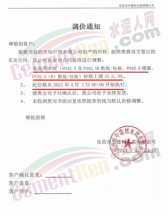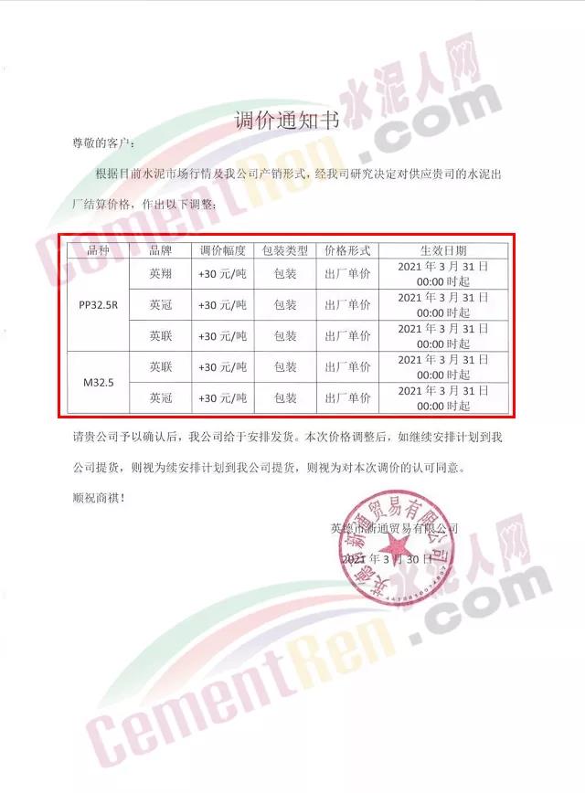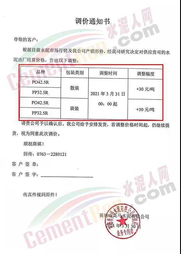 感謝您長期以來對我公司產品的信任和支持。因生產成本增加,庫存緊張,經我公司研究決定:為了確保持續向客戶保質保量提供優質產品,自2021年3月31日早8點開始對我公司產品價格做出如下調整:P.O42.5等級水泥產品在原價基礎上上調30元/噸。我公司將以微信或短信形式發送調價通知,如貴公司繼續提貨則視為同意接受新價格。