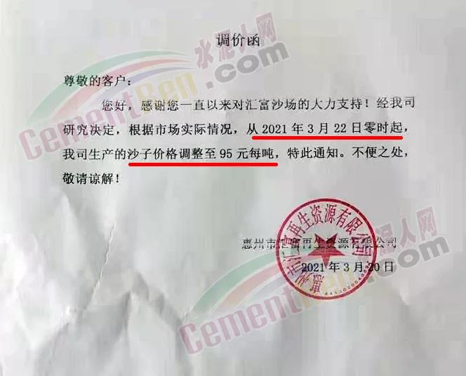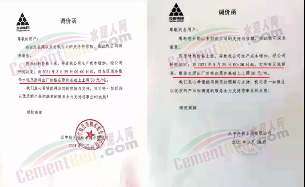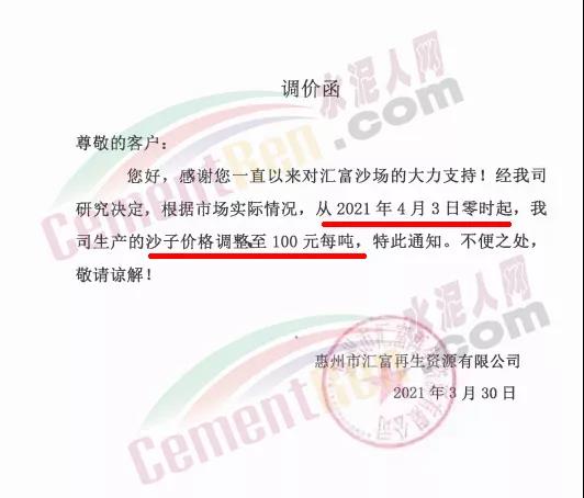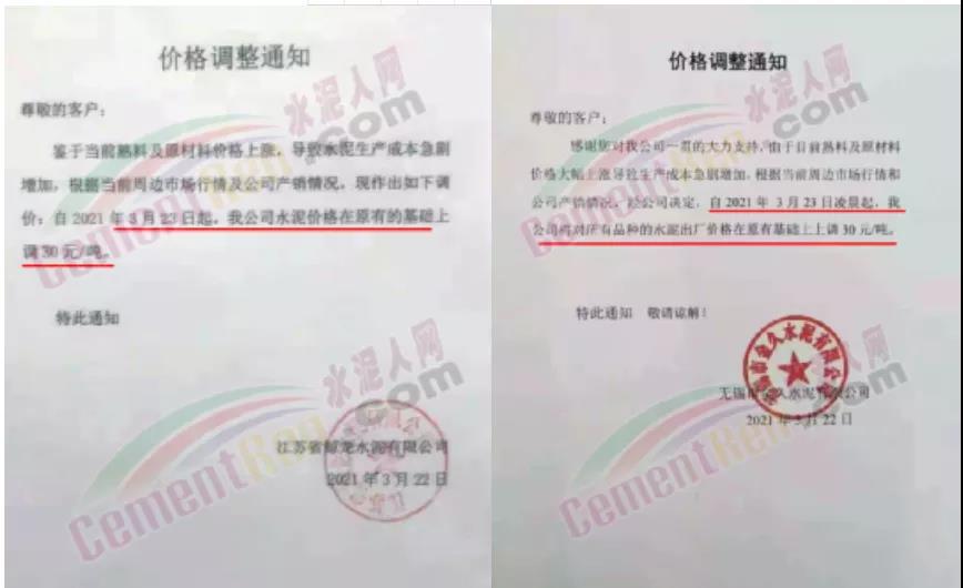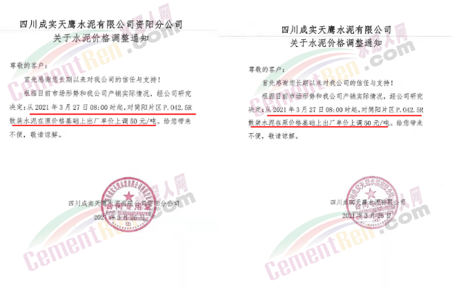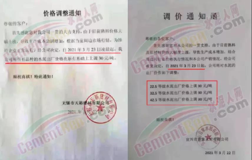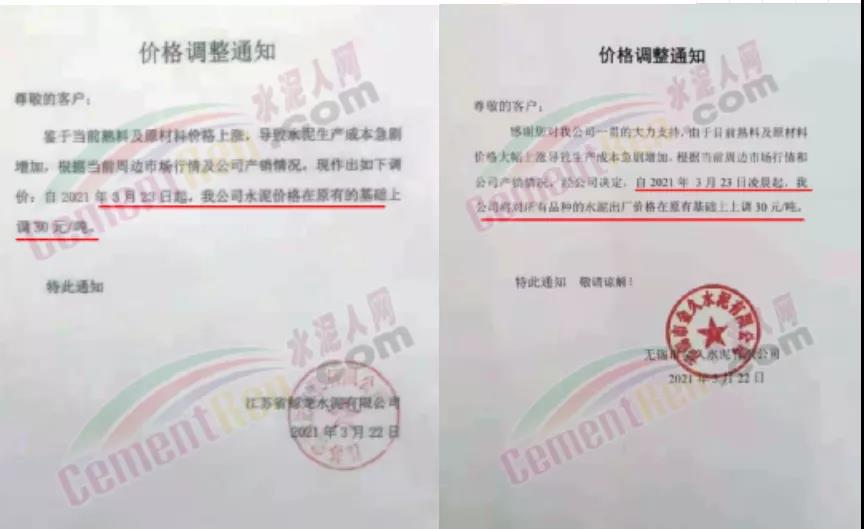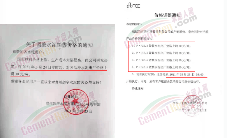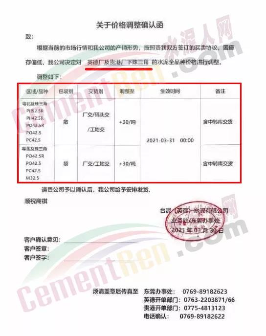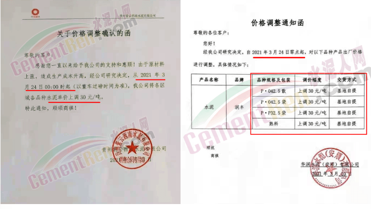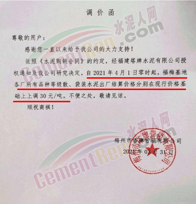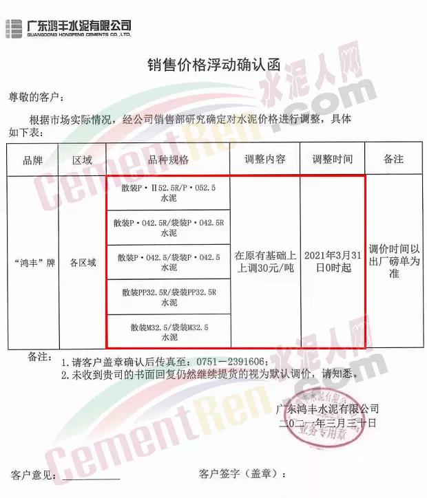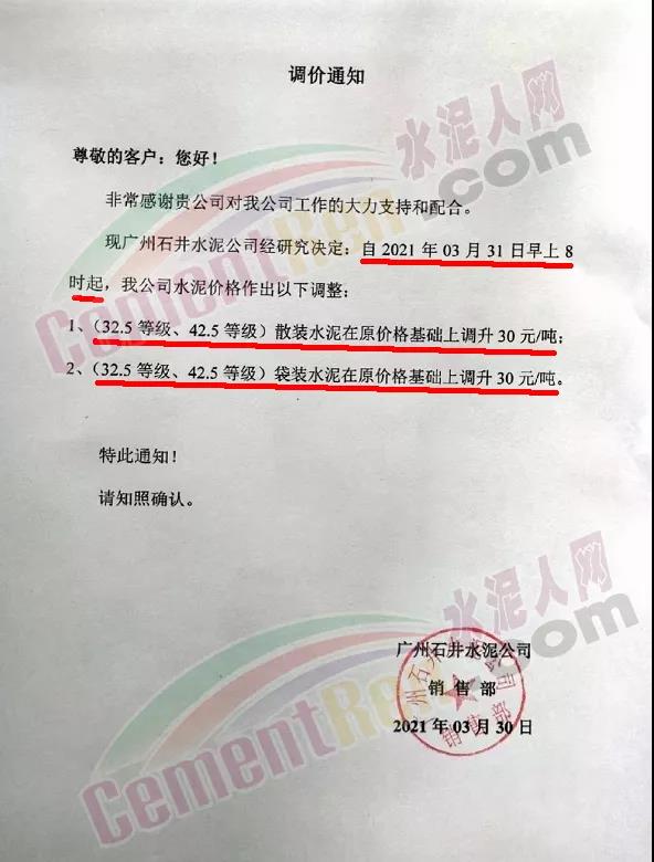 感謝您長期以來對我公司產品的信任和支持。因生產成本增加,庫存緊張,經我公司研究決定:為了確保持續向客戶保質保量提供優質產品,自2021年3月31日早8點開始對我公司產品價格做出如下調整:P.O42.5等級水泥產品在原價基礎上上調30元/噸。我公司將以微信或短信形式發送調價通知,如貴公司繼續提貨則視為同意接受新價格。
