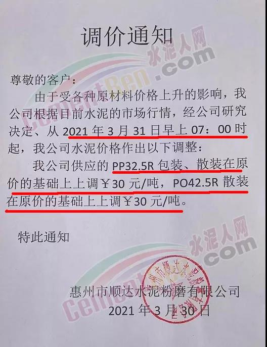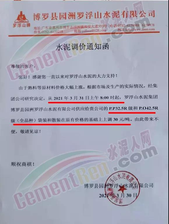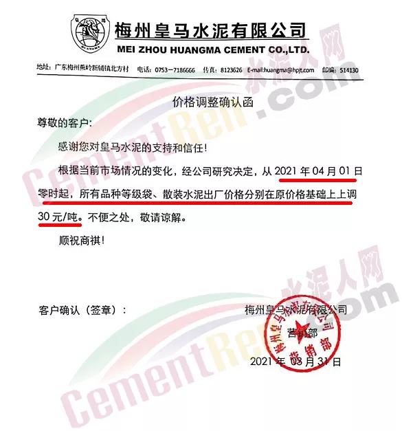梅州皇馬水泥有限公司通知從4月1日零時起,所有品種等級水泥出廠價上調30元/噸。