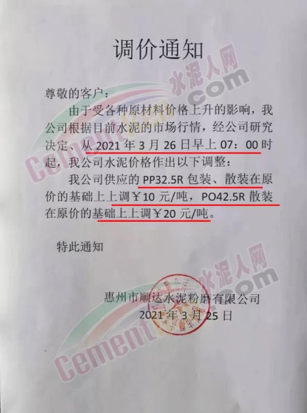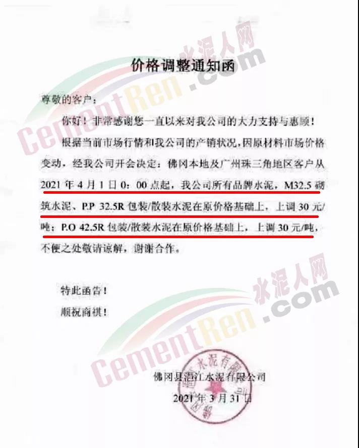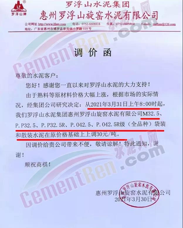 由于原燃材料大幅度上漲,經我司研究決定,從2021年04月1日起,我司發往廣東省的各品牌、各品種規格袋裝、散裝水泥出廠單價在原價格基礎上每噸上調30元。熟料出廠單價在原價格基礎上每噸上調20元。不便之處,敬請見諒。